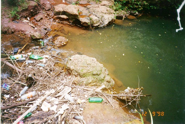 Além do problema do grande volume de água que é lançado neste rio advindo das precipitações no centro urbano, temos ainda grandes quantidades de lixo que é carreado juntamente com a água e despejos (figura 03). Dessa forma o problema parece ter sido afastado dos locais visíveis ao público e transposto para o interior do bosque, onde não é notado por quem usa o parque.